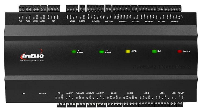 INBIO-460: Controladores de puerta y otras funciones Además de los relevadores para el control de las puertas, cuentan con entradas y salidas auxiliares fácilmente programables para control de luces, alarmas, detección de intrusos, vínculos o control manual. Comunicación Los paneles se instalan de forma sencilla en la red y soportan comunicación TCP/IP y RS485. La herramienta de búsqueda permite encontrarlos en la red y configurar los parámetros fácilmente. Capacidad El sistema soporta hasta 3.000 plantillas de huellas digitales, 30.000 tarjetas y almacena hasta 10.000 eventos y transacciones. La información permanece guardada en la memoria interna en caso de pérdida de energía. El controlador continúa operando aún si se interrumpe la conexión de red. Avanzado Control de Acceso Integrado Cuentan con funciones avanzadas de control de acceso tales como anti-passback, verificación multi-usuario, huella y contraseña de coacción, vínculos con entradas y salidas auxiliares, entre otras.