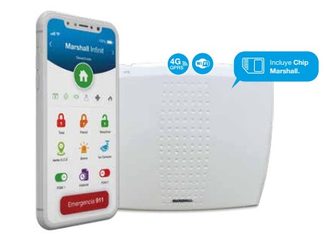 ¿QUE INCLUYE? - Chip de comunicación especial MARSHALL (MOVISTAR) - Cartel de propiedad protegida. - Sticker autoadhesivo MARSHALL. - Manual de instalación Digital. - Aplicación gratuita Marshall Infinit para iOS y Android. Desafiamos los límites 4G + 3G + 2G + WiFi. Comunicación asegurada Central de Alarma domiciliaria inalámbrica Marshall 4 Infinit 4G + WiFi Al incluir doble aviso presenta la ventaja de poder utilizar diariamente vía WiFi sin costos adicionales y en caso de ser necesario siempre tener como backup el aviso por 4G GPRS. Control total desde el celular estés donde estés. AHORA CON VIDEO VERIFICACIÓN: Marshall se une a las principales marcas de CCTV a nivel mundial para que puedas ver tus cámaras desde la comodidad de una sola APP. En caso de disparo de robo, ahora rápidamente vas a poder realizar una video verificación. Consultar marcas disponibles. NUEVO PANEL MARSHALL 4 INFINIT CON TECNOLOGÍA 4G GPRS + WIFI Desafiamos los límites 4G + 3G + 2G + WiFi. Comunicación asegurada. El nuevo panel Marshall 4 Infinit es mucho más que una central de alarma, es una forma de entender la seguridad y la protección de los hogares y familias. Es un concepto que hemos desarrollado a partir de la tecnología más avanzada aplicada a la protección, la calidad y la simpleza de uso para usted. IMPORTANTE: CHIP INCLUIDO! Cada kit Marshall 4G incluye un chip que será habilitado al momento de contratar el plan de datos para que puedas comandar el sistema en tiempo real desde nuestra app. VALOR DEL PLAN. VENTAJAS DE USAR EL CHIP INCLUIDO. - Garantía extendida de 12 a 18 meses. - Precio de abono inferior a las compañías celular. VENTAJAS DE MARSHALL 4 INFINIT VS ALARMAS QUE USAN SMS. - Tu alarma en tiempo real: Olvidate de la lentitud de los SMS y pasá a tener tu alarma en tiempo real y recibir tus notificaciones al instante con nuestra app. - Sin depender del saldo: Imagínate no recibir una alerta porque te olvidaste de cargarle saldo a tu alarma! Sería una situación muy incómoda. Con Marshall 4G no vas a necesitar hacerlo ya que siempre estará disponible para enviarte notificaciones y para que puedas comandarla desde la app. - Sin límite de uso: Usa tu app el tiempo y la cantidad de veces que necesites sin estar pendiente del saldo tuyo y del panel! - Precio menor al SMS: Solo abonas $399 pesos argentinos final por mes (por menos de lo que te sale Netix proteges tu hogar!), mientras que por SMS gastarías un promedio de $600. Es decir que vas a pagar menos de la mitad! - Mayor velocidad en la recepción de eventos: Las notificaciones PUSH de Marshall 4G son hasta 10 veces más rápidas que el SMS, por lo que te vas a enterar mucho más rápido de lo que sucede en tu hogar VS una alarma por SMS. - Doble Comunicador: Gracias a su comunicador 4G/3G + WIFI siempre vas a recibir los eventos más importantes. //////////////////////////////////////////////////////////////// FUNCIONES DESTACADAS DE MARSHALL 4 INFINIT 4G + Wifi - Tu alarma en TIEMPO REAL, sin necesidad de consultar el estado. - Doble Comunicador 4G/3G + WIFI - 15 zonas inalámbricas + 6 cableadas para máxima cobertura. - Alertas por ROBO, ASALTO, EMERGENCIA MEDICA, INCENDIO, ENTRADERA. - Activación en MODO ESTOY y MODO ME VOY. - Botón de llamado directo al 911 para que rápidamente puedas dar alerta. - Alerta de S.O.S. compartiendo tu ubicación vía Whatsapp. - Sistema anti entradera incorporado para máxima seguridad. - Sistema de confirmación de intrusión para que nunca tengas un falso disparo. - Sistema de activación automática. - Aviso a 5 personas mediante notificaciones PUSH. - 2 salidas PGM para encender luces, abrir portones, riego y mucho más. - Configura y personaliza tu alarma en simples pasos con tu APP. - Confirmación hablada de cada acción que realices en tu APP. - Asistente virtual para programación. - Alertas ante emergencias médicas. - Posibilidad de agregar sensores y barreras cableadas. - Zona especial para incendio con detectores de humo inalámbricos. - Aviso de corte y restitución de energía eléctrica. - Personaliza cada zona de tu hogar con un nombre específico. - Aviso de batería baja de sensores. - Historial de eventos disponibles en APP. - Led de activación de sirenas.